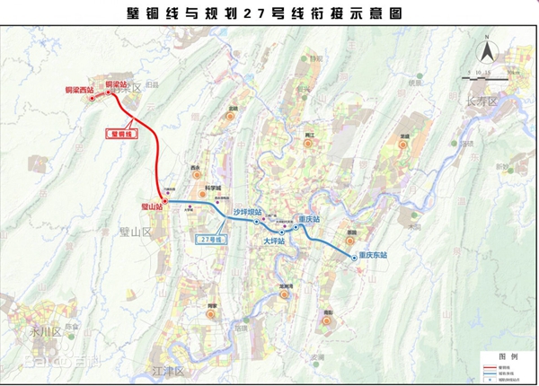 重慶軌道交通27號線是一條東西走向的軌道快線,西起璧山,東至重慶東站,將串聯起大學城、沙坪壩、大坪、南坪、茶園等組團,據公開資料顯示,軌道27號線項目正線全長約 52公里,從璧山出發,向東穿縉云山后,經虎溪站、大學城南站、寨山坪站至西永站,后穿越中梁山至磁器口站、沙坪壩站,石橋鋪站、大坪西站,到達重慶菜園壩火車站,然后穿越長江到達后堡和南坪站,后抵達茶園新區的重慶東站。27號線的定義是一條城軌快線。也就是說該條線路均為大站設計,每個站點之間的間距較長,從而實現更少的停靠和更快的速度。27號線的高運行速度高達 140km/h,已經接近于目前的快速列車了。由此可見,27號線是串聯重慶主城東西走向的快速通道,對于完善主城的交通布局,分流一號線的壓力,具有重要的價值和意義。